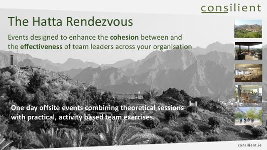 Do you want a different type of teambuilding event that combines theoretical team leadership sessions with activity-based team challenges? Click the image alongside to watch a 1 minute 51 second video showcasing The Hatta Rendezvous, an offsite event aimed at enhancing the cohesion between and the effectiveness of your organisation's team leaders.